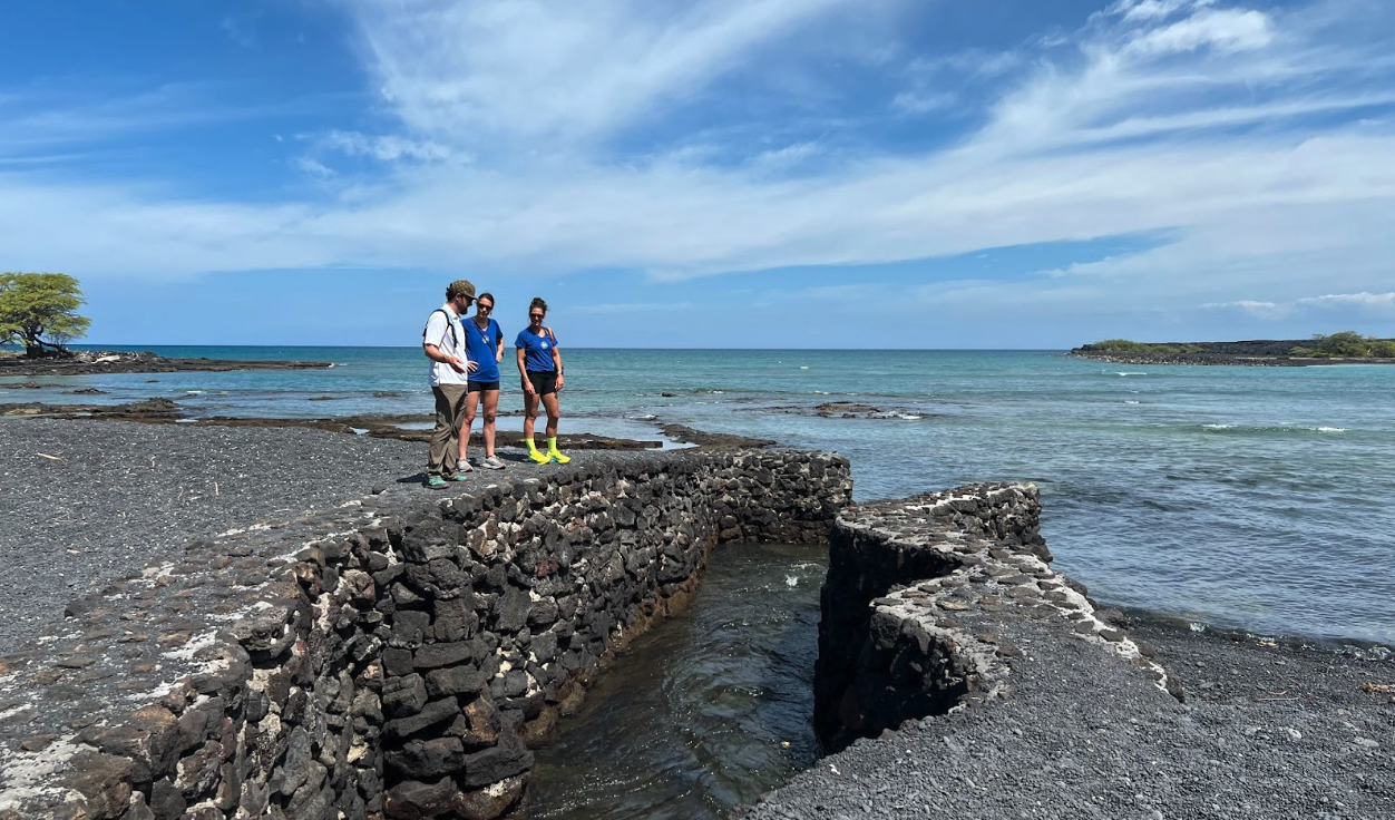 Zach Horton, Sr. Associate and Director of Philanthropy for TNC shows Katie and Jenny Emick the 200 foot stone channel that serves as safe passage from the fish ponds to the ocean.